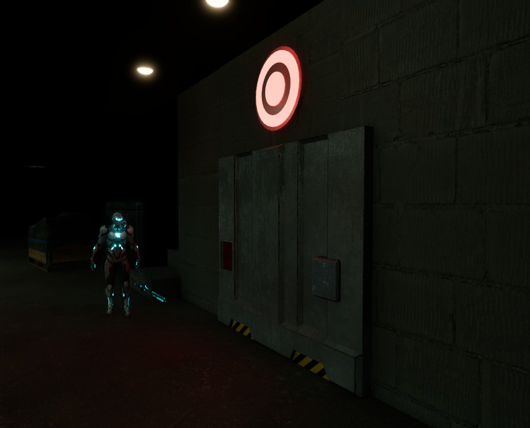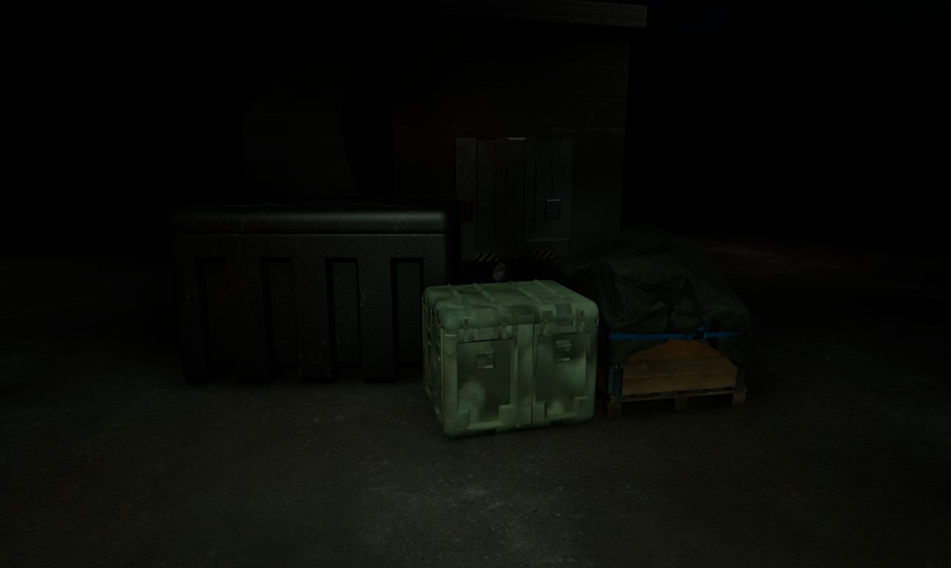 I chose rough and dirty materials to texture the environment as well as matching assets for hiding opportunities. The goal was to make the game feel mechanical and worn out. This is served by old wooden crates, rusted supply boxes, and dingy concrete floors. I custom made some materials such as the metallic vent texture and emissives.