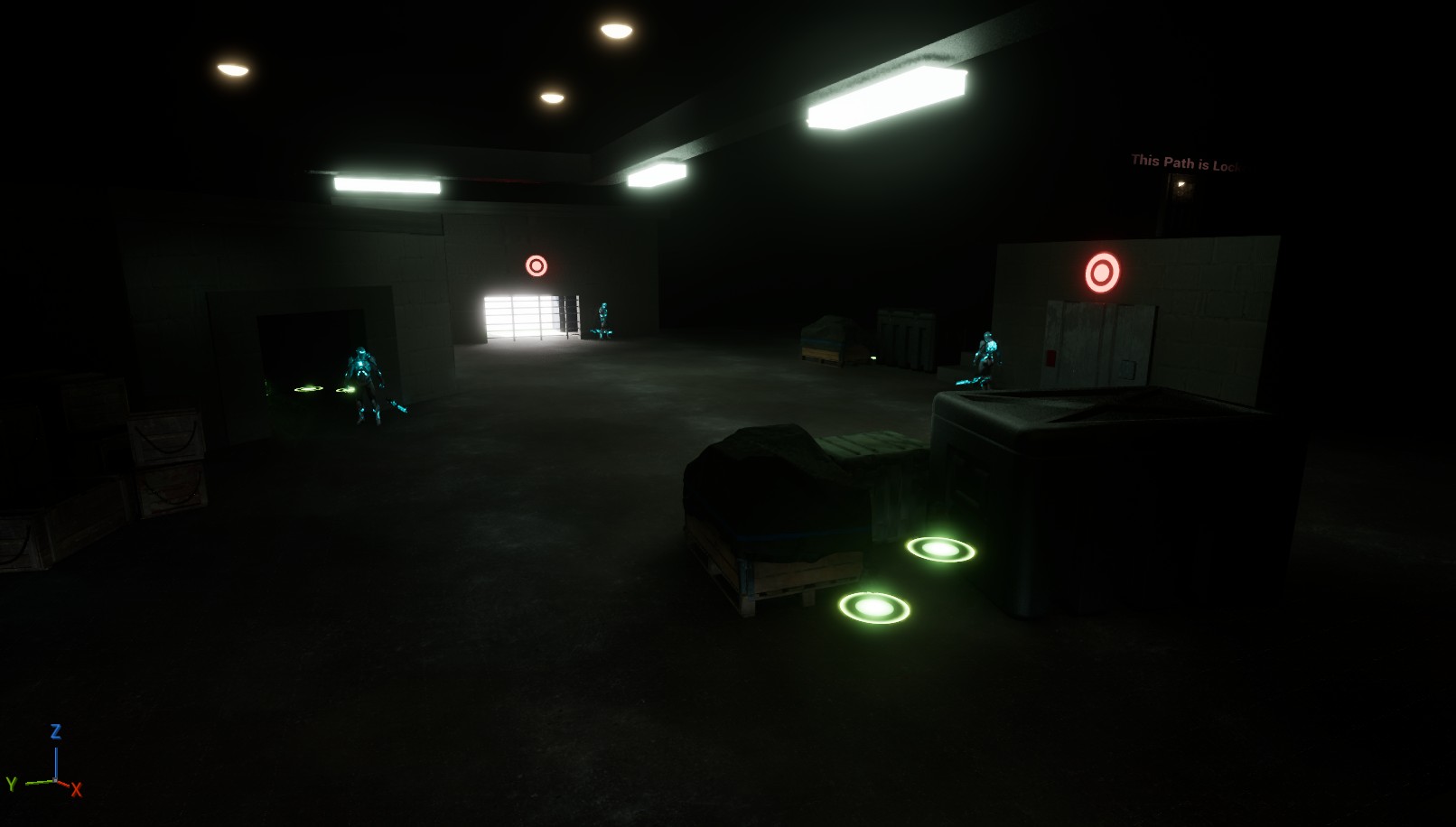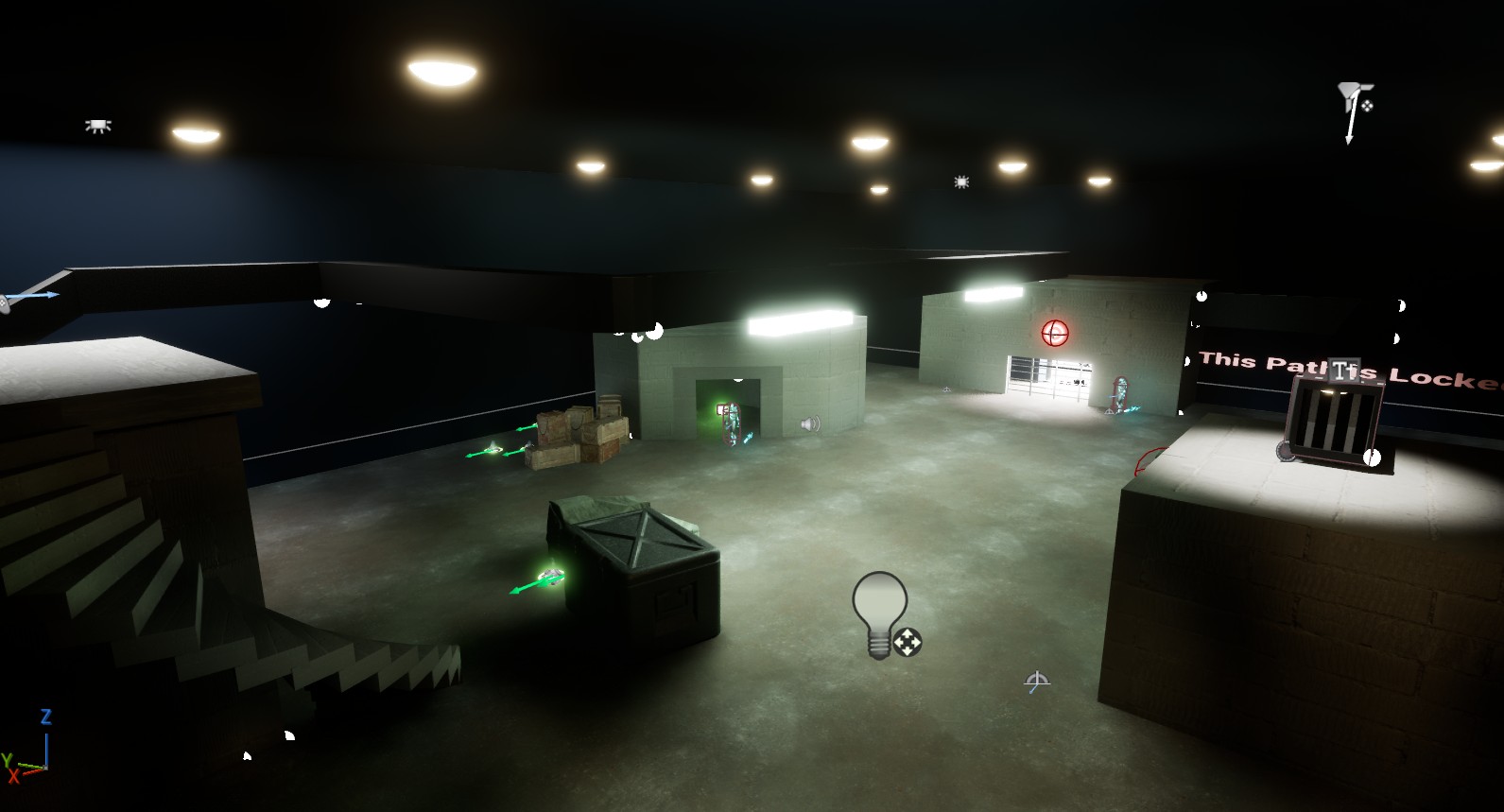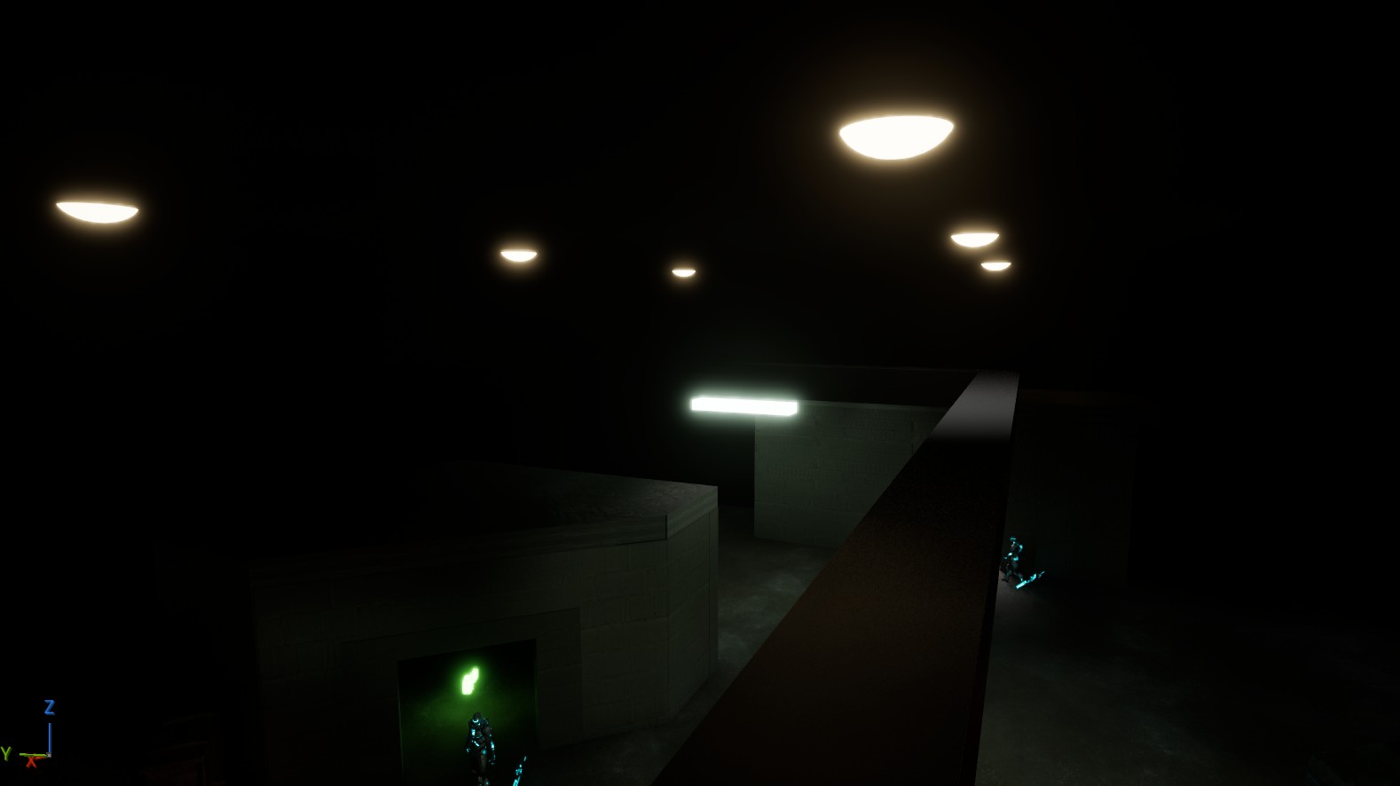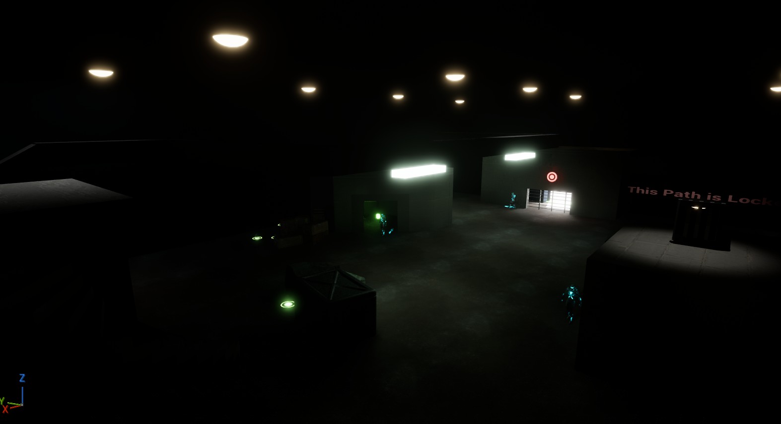The music and sound effects were designed similarly to the lighting. The eerie music of impending doom is slightly quieter along the darker edges of the map and above the vents where the player is least likely to be spotted by enemies. The intention of this was to bring the players moments of ease in between their runs through open areas.